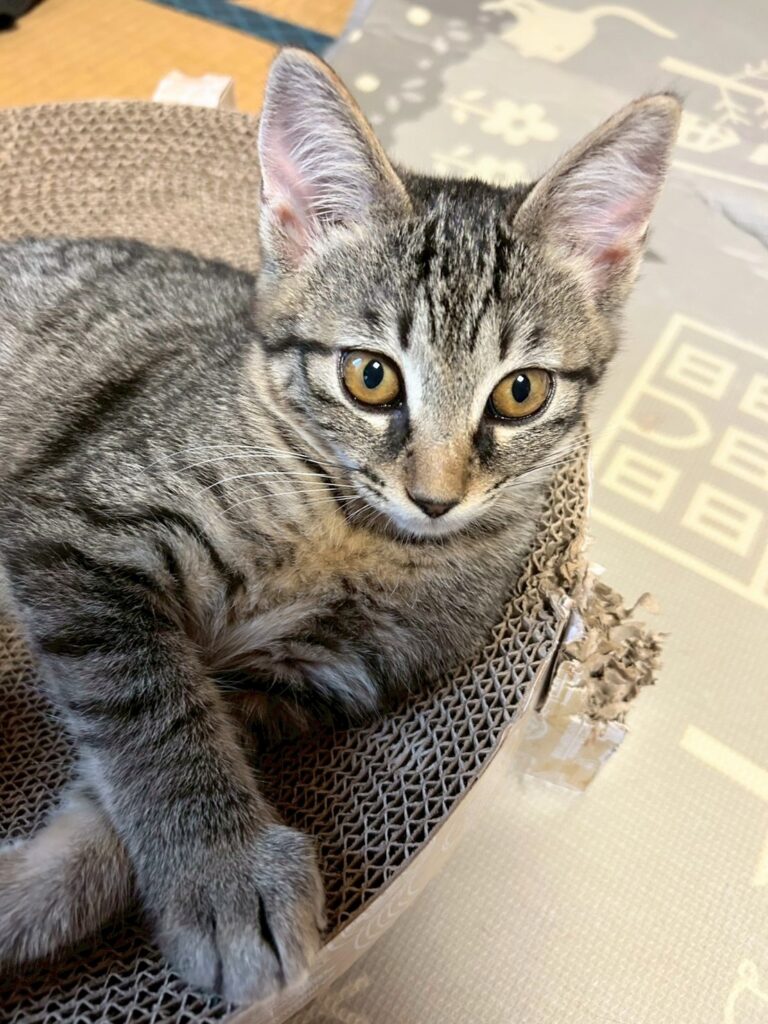 好奇心旺盛、抱っこもできます、ちっこいのに度胸があります。食が細いので回数多めです。今は散歩しながら成猫ご飯を、つまみ食いしてます。現在、猫砂トイレからシステムに移行訓練中どちらも、人馴れしています。