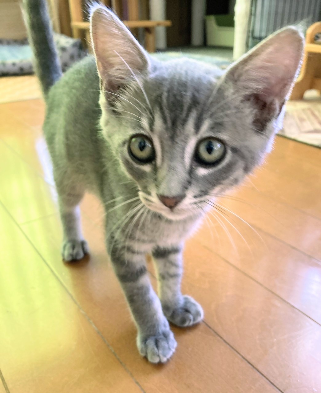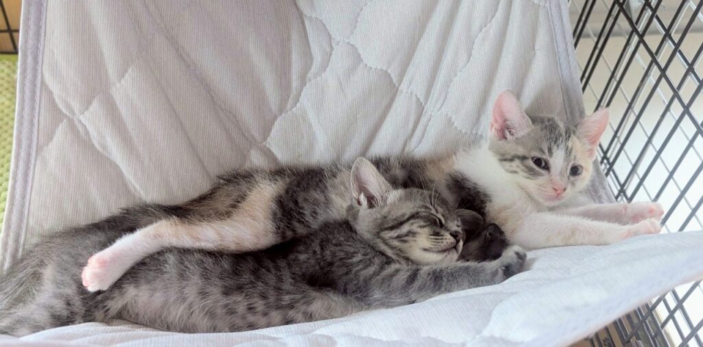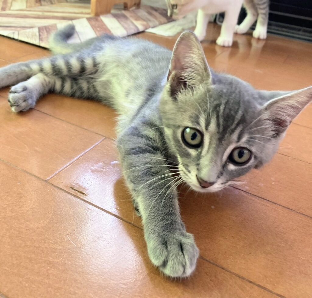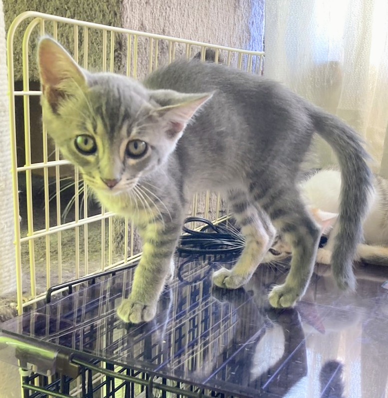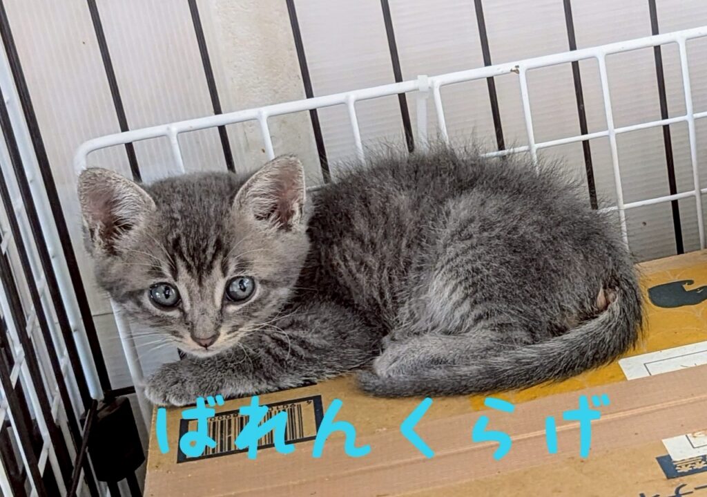 卒業生 ばれんくらげくん→バレンくん / 2025年9月譲渡決定 2025年6月保護 生後3週くらいグレー・オス 保護依頼主さんの家の車庫の隅で子育てをしているのを発見されて3匹保護されました。まだ小さかったためミルク併用で離乳食を開始しましたが、途中下痢が続き点滴をしたりと大変でしたがようやく体調が安定してきたのでデビューします。とても活発で食いしん坊です。代表宅の子猫部屋で暮らしています。 兄妹はふうりんくらげ、おわんくらげ