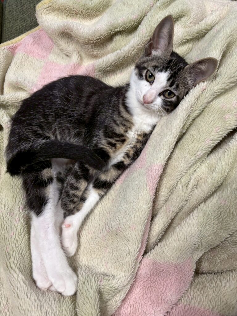 この子猫達の母猫は避妊手術をしました。その後4匹保護をしました。1匹は亡くなったそうです。預かりスタッフのもとでくれないと一緒に過ごしています。