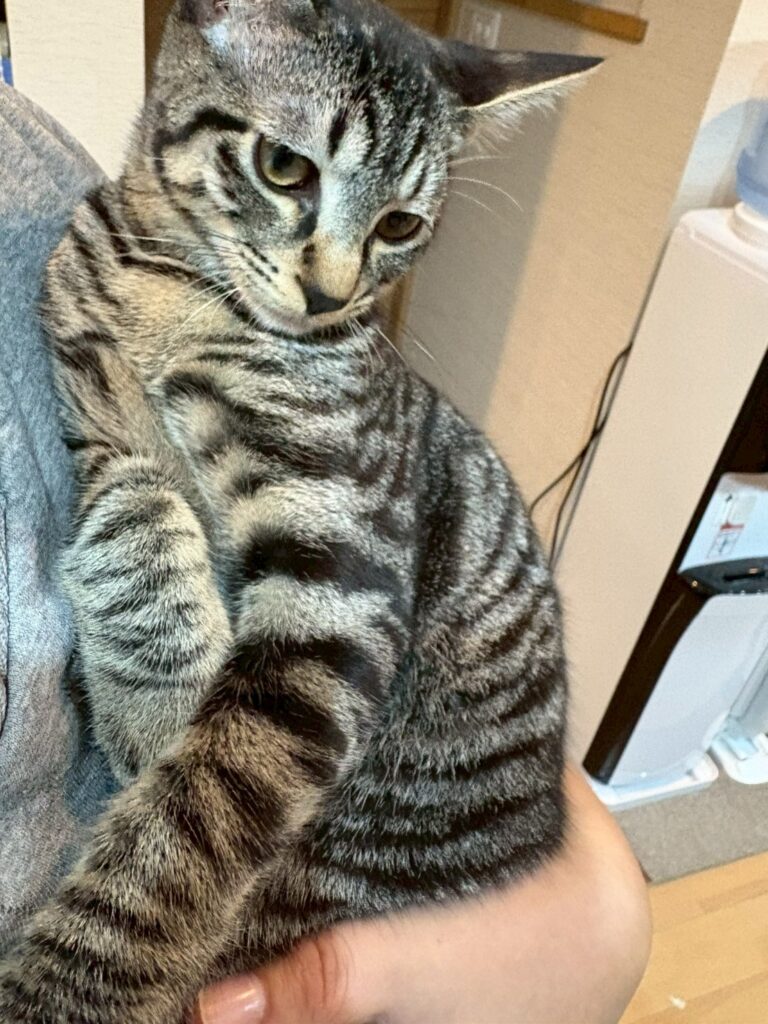 小さい赤ちゃんの頃は兄妹を守るように威嚇をしてましたが、今では甘えん坊で良く遊ぶ懐っこい子になりました。母猫のこもちくらげが2カ月間しっかりと子育てをしてくれたので、健康で穏やかな子に育ちました。甘えん坊です。