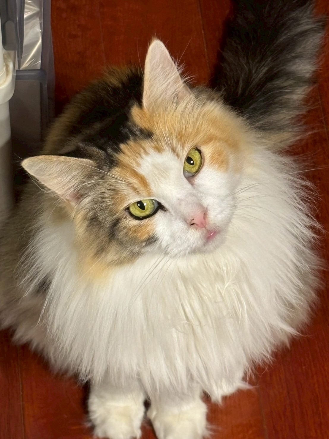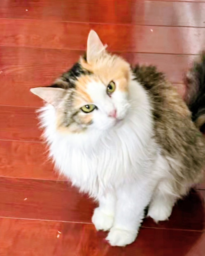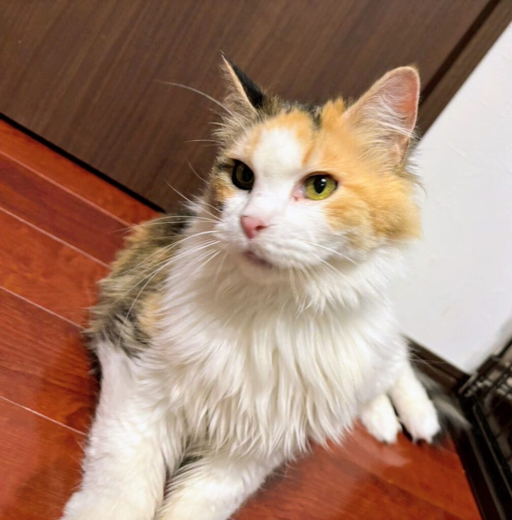 お寺の境内に住み着いている長毛の猫がいると連絡がありました。大人猫なので緊急性がないのと、依頼主さんとの保護費用の調整がつかなかったのでしばらくお寺に隠れていましたが見かねたスタッフが保護費用を払いピリカで引き受ける事になりました。その容姿からわかるようにノルウェイジャンフォレストキャットのミケ柄なので遺棄でしょう。しかも未去勢でした。しばらく山を彷徨ったのか、ダニがたくさんついていて毛も絡まり痩せていて酷い状態でした。人馴れはしていましたが、体調が悪くてしばらく預かりスタッフの元で治療をしていました。順調に回復してきましたが、ある日突然後ろ足に力が入らず傾いて歩くようになりました。すぐに高度先進医療の病院へ受診しましたが、はっきりとした原因はわからず、様子見をすることになりました。