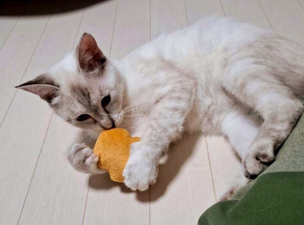 避妊手術をした日に預かりスタッフ宅へ移動しました。少しずつ馴れてきています。新たに預かった子猫のまににと一緒に過ごしている間に人馴れが進んできました。よく遊びます。