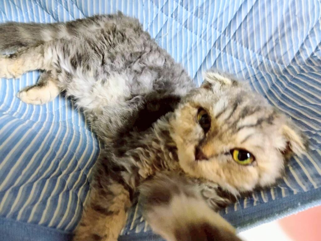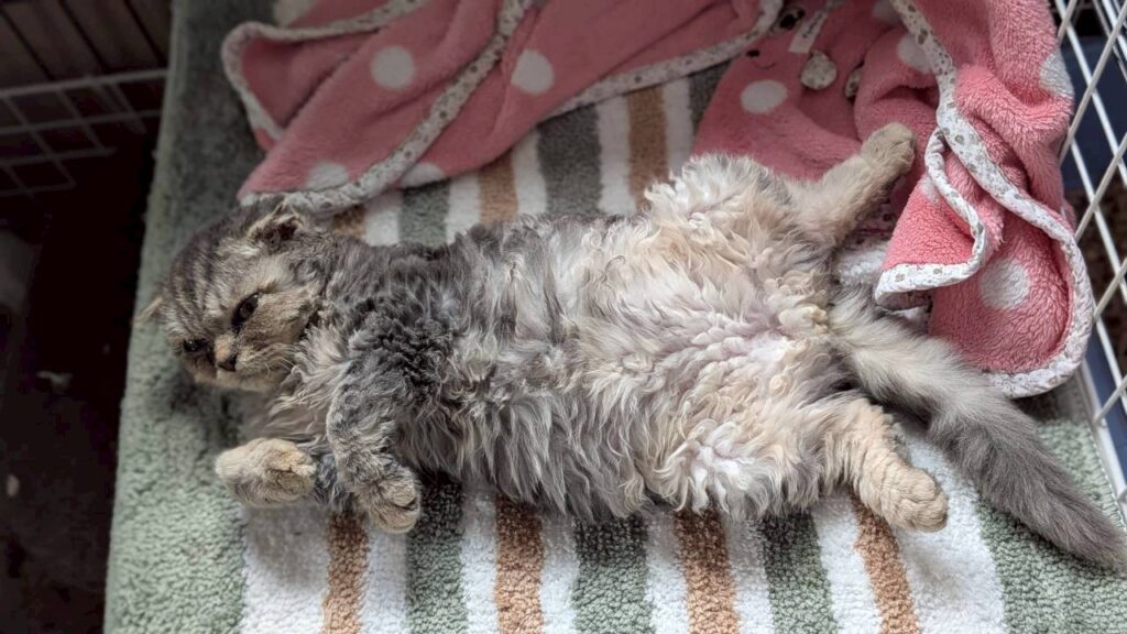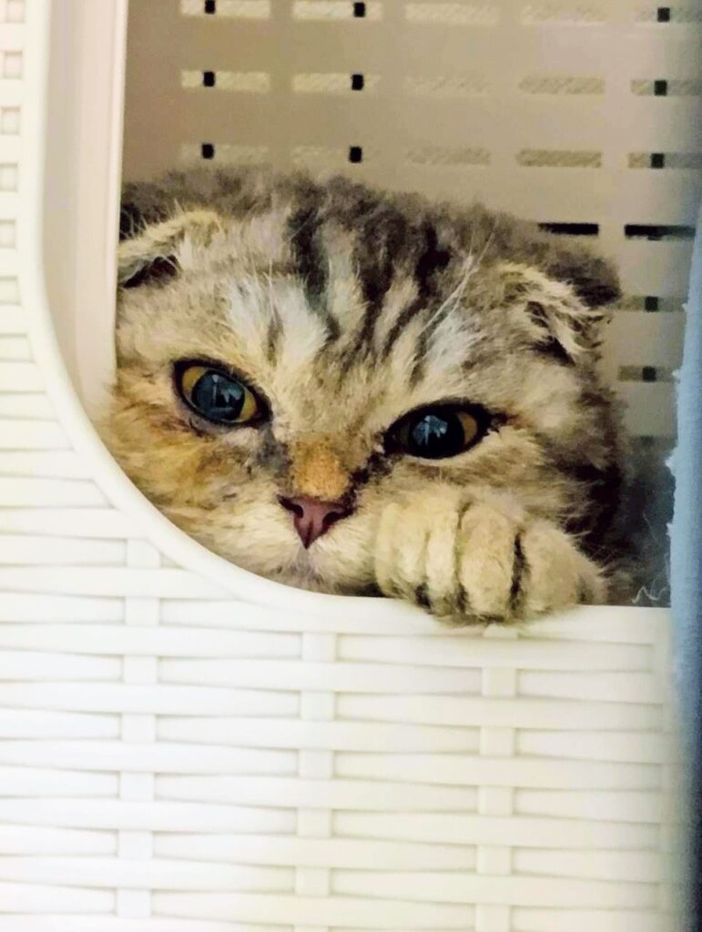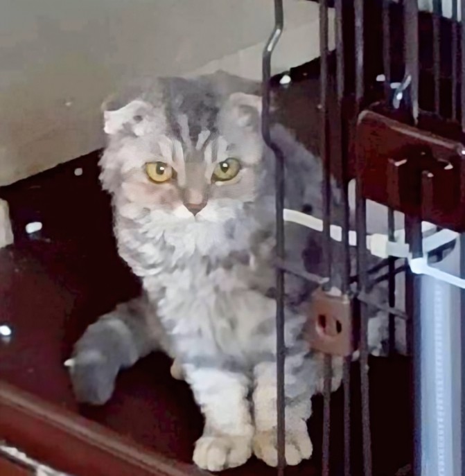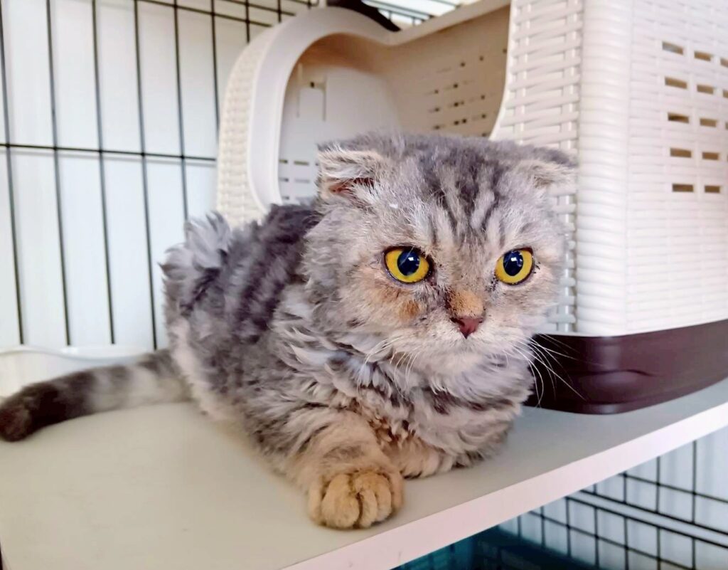 山の下の道路脇にうずくまっていたところを見つけてもらい保護されましたが、保護者は犬を多頭飼いしているため、猫を飼うのは難しいと保護依頼がきました。慣れている折れ耳のスコティッシュは野良ではありえないため、遺棄だと思われます。スコティッシュは見た目が可愛くて人気がありますが、生まれつき関節炎を患っています。これは一生付き合わなければならないです。正しい知識を持って飼ってくれる方に譲渡をしたいです。