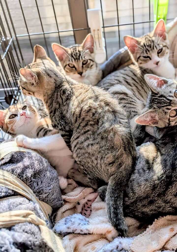 ご飯をもらっていたお宅に、どこかで出産をした子猫5匹を連れてきてしまいました。生活環境課経由で保護依頼がきたので全て保護をしてウィルス検査をしたところ全頭エイズウィルス陽性でした。母猫がエイズキャリアだと母子抗体移行のため子猫は陽性反応がでますが、半年近くになれば陰性になることが多いです。