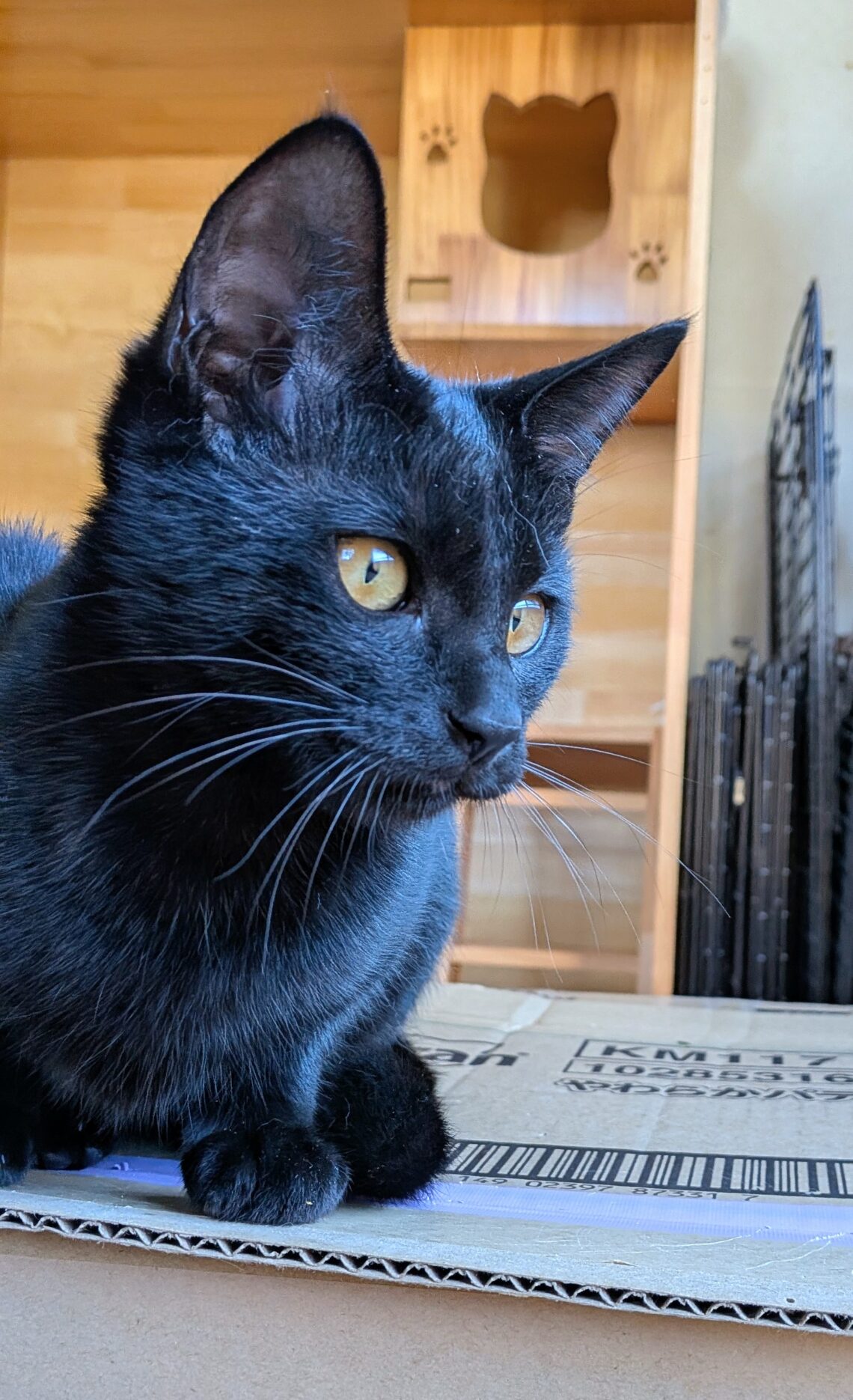 少し毛足が長くふわふわしていて、茶色がかった黒になってきました。最近はスレンダーになってあまりふあふあ感がなくなってきました。食いしん坊でものすごくなつっこい子です。姉妹はさーらです。