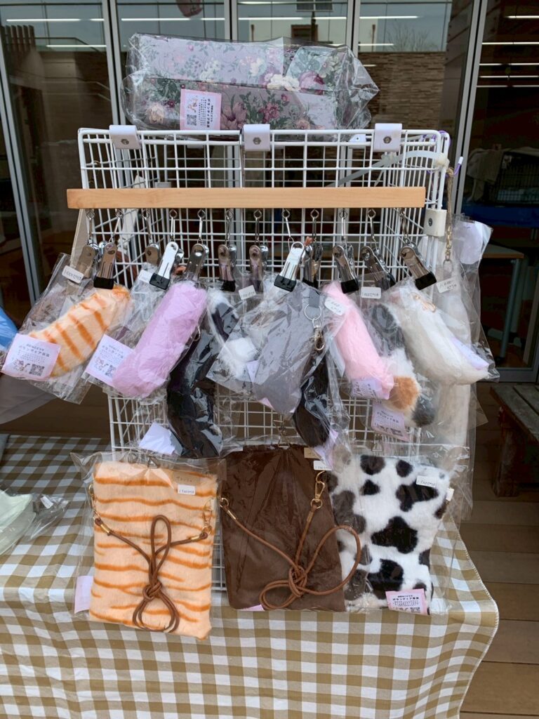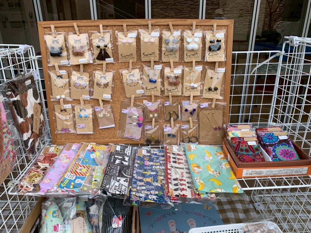 ご寄付のお礼にスタッフ手作りグッズを差し上げています。猫用おもちゃや人用雑貨等可愛いグッズがたくさんあるので、是非ゲットしてください♡
