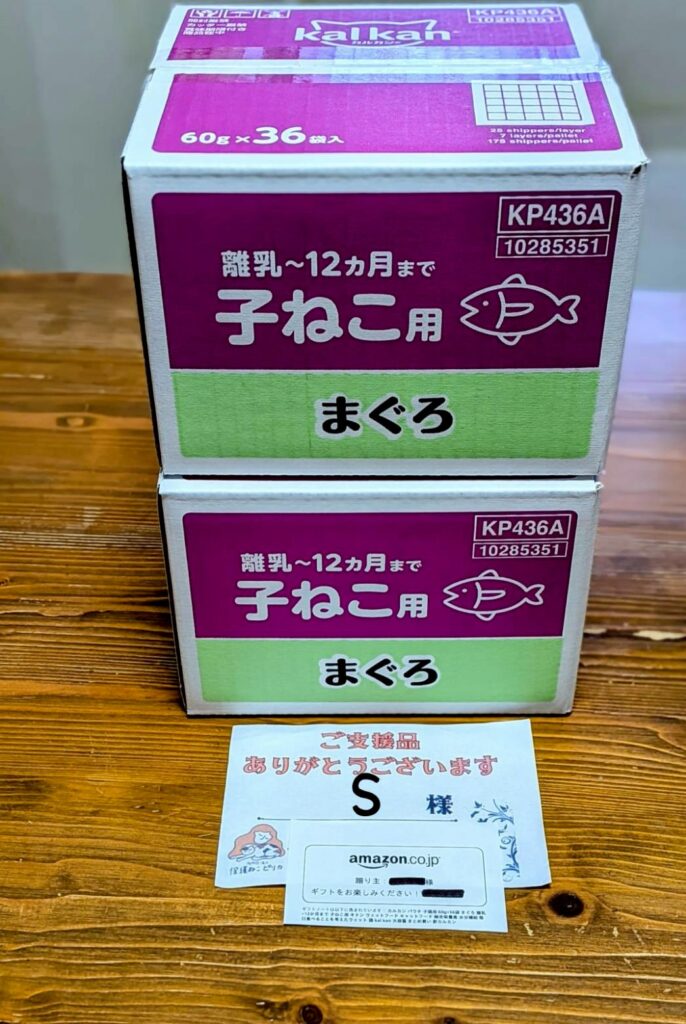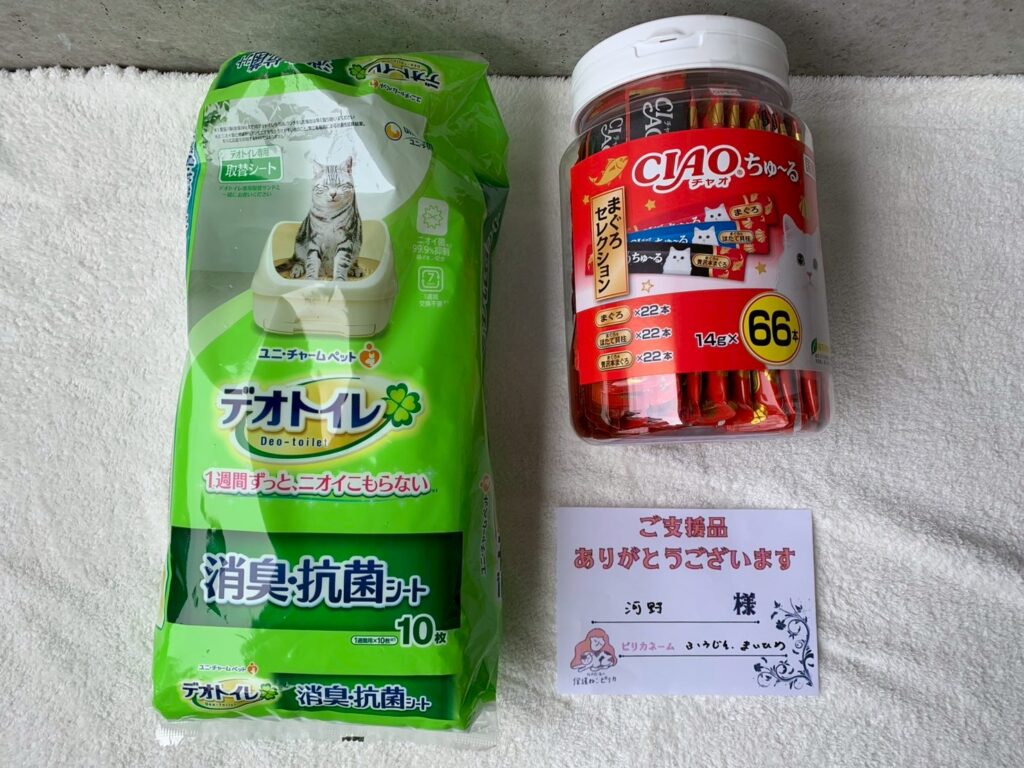 会場への持ち込み寄付やAmazonほしい物リストからの物資支援や現金振込みによる支援金等たくさんのご寄付を賜りありがとうございました。保護をした猫達、譲渡が難しい猫達への医療費やご飯代として大切に使わせてもらいました。