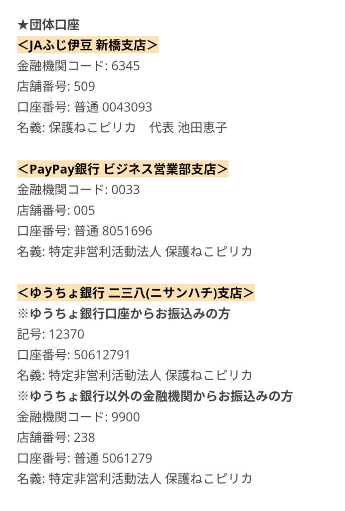 ご支援の振込み先のご案内